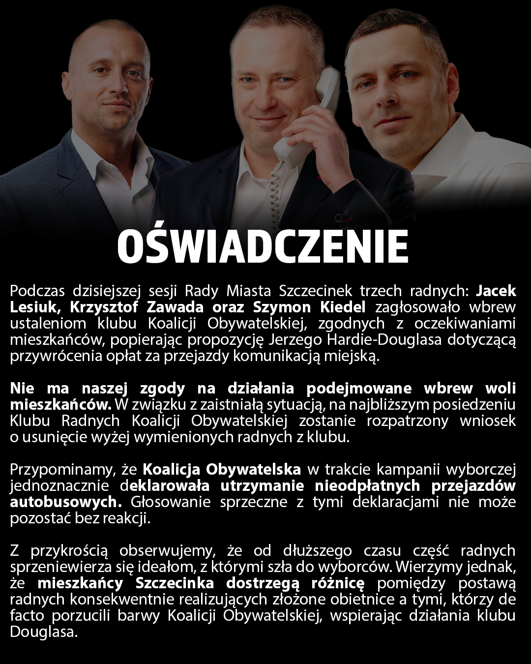 „Podczas dzisiejszej sesji Rady Miasta Szczecinek trzech radnych: Jacek Lesiuk, Krzysztof Zawada oraz Szymon Kiedel zagłosowało wbrew ustaleniom klubu Koalicji Obywatelskiej, zgodnych z oczekiwaniami mieszkańców, popierając propozycję Jerzego Hardie-Douglasa dotyczącą przywrócenia opłat za przejazdy komunikacją miejską.