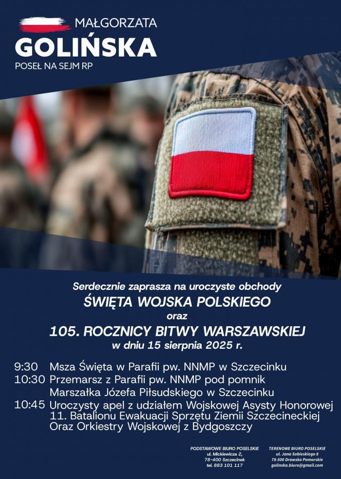 W piątek 15 sierpnia przypada Święto Wojska Polskiego i 105. rocznica Bitwy Warszawskiej. Na obchody zaprasza poseł Małgorzata Golińska.