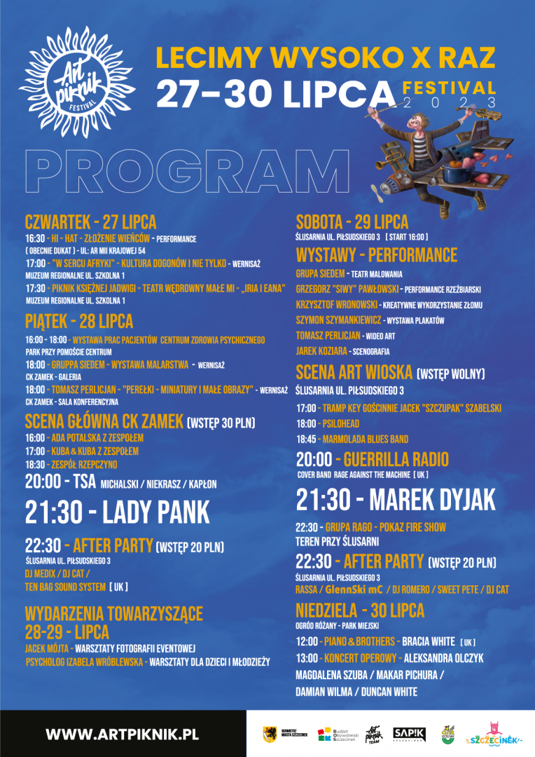 W tym roku na scenie Art Pikniku wystąpi kultowy zespół Lady Pank, a także Marek Dyjak, Guerrilla Radio, TSA Michalski Niekrasz Kapłon, Kuba i Kuba, Ada Potalska, Tramp Key, Psilohead oraz Piano&Brothers.
