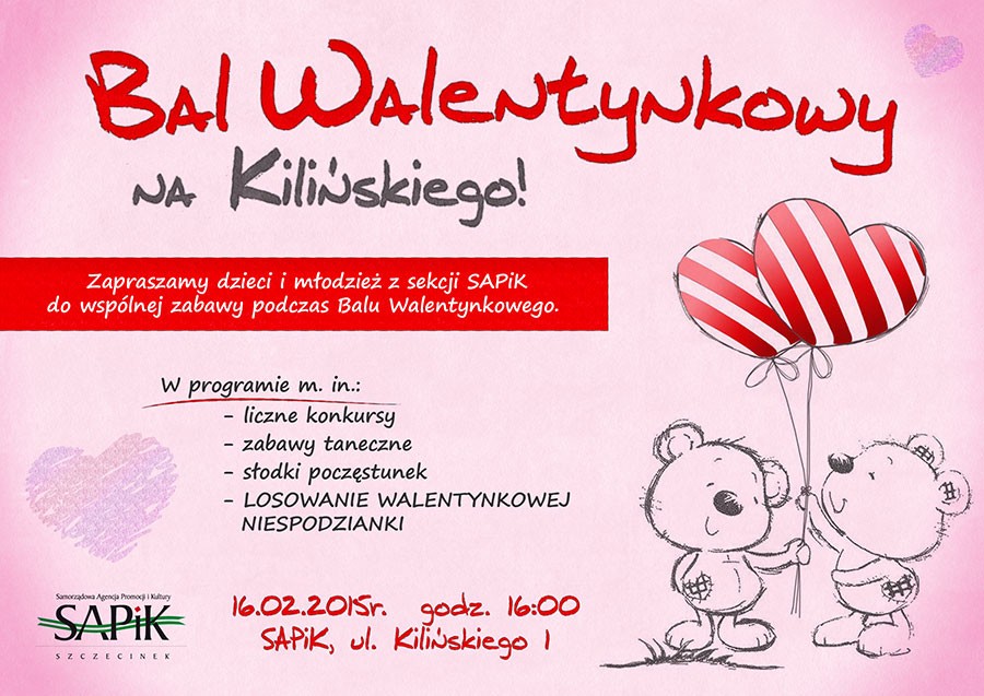 Samorządowa Agencja Promocji i Kultury w Szczecinku, zaprasza wszystkie dzieci i młodzież z sekcji SAPiK-u oraz dzieci niezrzeszone w klubach, na zabawę integracyjną "WALENTYNKI NA KILIŃSKIEGO" - 16 lutego 2015 r. godz. 16:00, ul. Kilińskiego 1. Wstęp wolny. W programie zabawy taneczne, liczne konkursy, słodki poczęstunek a wśród uczestników zabawy rozlosowana zostanie walentynkowa niespodzianka. Motywem przewodnim zabawy jest kolor czerwony - przebieramy się jak chcemy, byle z czerwonym akcentem. (sapik)