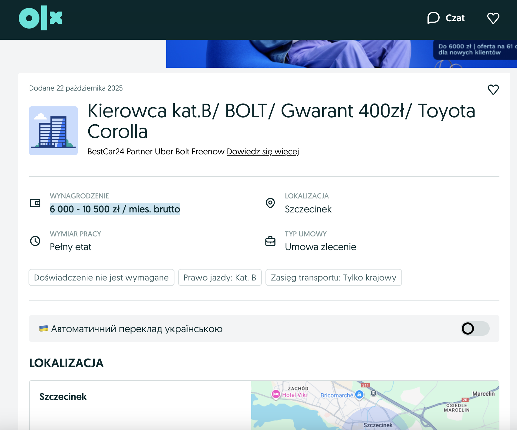 W serwisie OLX dostępna jest oferta pracy w Bolt w Szczecinku. Firma poszukuje kierowcy z kat. B (minimum rok uprawnień) do jeżdżenia firmową taksówką Toyota Corolla. Trzeba mieć minimum 20 lat, zaświadczenie o niekaralności. Bolt gwarantuje dniówkę aż 400 zł, a wypłaty co tydzień. Wynagrodzenie podane w ogłoszeniu to 6 000 - 10 500 zł / mies. brutto (umowa zlecenie).