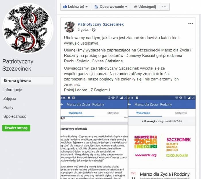 Dziś (środa, 29.05) w godzinach popołudniowych członkowie Patriotycznego Szczecinka, którzy współorganizowali Marsz dla Życia i Rodziny i którzy opublikowali wspomniane zaproszenie, opublikowali na swoim fanpage'u na Facebooku taki oto komunikat:
