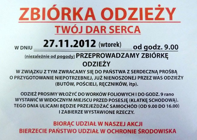 Od kilku dni wielu mieszkańców może znaleźć w swoich skrzynkach pocztowych ulotki informujące o odbywającej się 27 listopada na terenie Szczecinka zbiórce odzieży. Kawałek papieru sprawia wrażenie wiarygodnego, a cała akcja jest z pewnością dobrze zaplanowana. Jednak po bliższym przyjrzeniu się ulotce, pojawiają się pytania. Na kartce widnieje tekst „Zbiórka odzieży. Twój dar serca. W dniu 27.11.2012 od godz. 9.00 (niezależnie od pogody) przeprowadzamy zbiórkę odzieży. W związku z tym zwracamy się do państwa z serdeczną prośbą o przygotowanie niepotrzebnej, już nienoszonej przez was odzieży (butów, pościeli, ręczników, itp). Odzież prosimy włożyć do worków foliowych i od godz. 9 rano wystawić w widocznym miejscu przed posesję/klatkę schodową. Tego dnia ulicami będzie przejeżdżać samochód (od 9.00 do 16.00) i zabierze wystawione rzeczy. Biorąc udział w naszej akcji bierzecie Państwo udział w ochronie środowiska”.