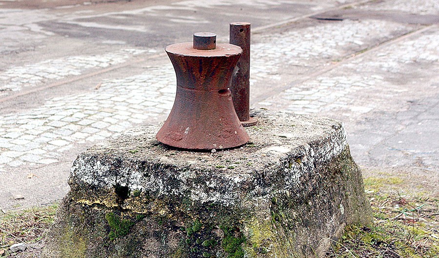Wbrew pozorom ten metalowy poler, albo jak kto woli pachołek, nie ma nic wspólnego z portowym nabrzeżem. Urządzenie to znajduje się na terenie byłych magazynów Hurtowni Artykułów Przemysłowych i Spożywczych Gminnej Spółdzielni Samopomocy Chłopskiej przy ul. Armii Krajowej. Magazyny położone są pomiędzy kompleksem koszarowym przy ul. Słowiańskiej a torami kolejowymi. W odległych już czasach magazyny miały swoją kolejową bocznicę. Na teren prowadziły dwa niezależne tory kolejowe. Jeden z nich przebiegał wzdłuż rampy wielkiego spichlerza i dalej, do położonego w głębi terenu magazynu z towarami przemysłowymi, w tym m.in. tekstyliami i obuwiem. Metalowy pachołek służył do przeciągania wagonu kolejowego dokładnie w miejsce, z którego wyładowywano towar. Lina przewlekana była przez pachołek. Jeden jej koniec zaczepiano za hak na wagonie, drugi do samochodu lub ciągnika. Dziwnym zbiegiem okoliczności mocno przymocowany do żelbetowego postumentu poler - pachołek zachował się do dzisiaj, co można niemalże uznać za niezwykłe zjawisko zważywszy, że tego rodzaju urządzenia zazwyczaj padają łupem złodziei - złomiarzy. (m)