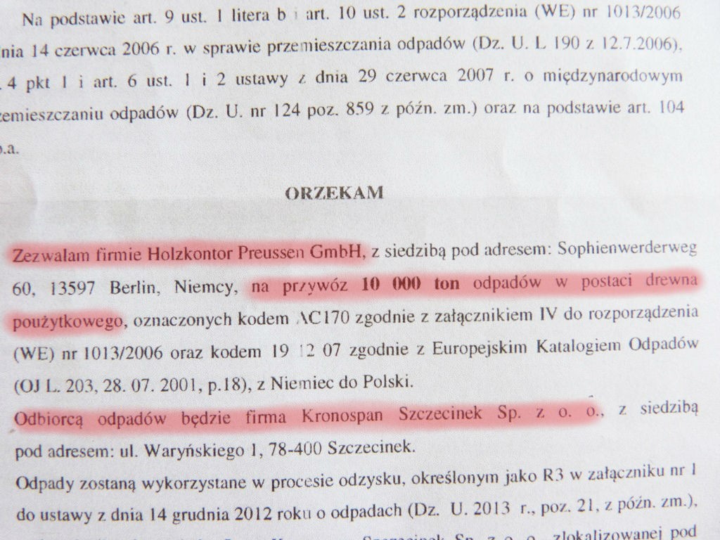 W udostępnionej naj przez członków SIS TERRA decyzji Głównego Inspektora Ochrony Środowiska o zezwoleniu niemieckiej firmie przywóz 10 tys. ton odpadów w postaci drewna poużytkowego czytamy, że w trakcie realizacji wspomnianego zezwolenia berliński dostawca został uprawniony do realizacji maksymalnie 580 transportów. Ich częstotliwość ma jedynie pozwalać firmie Kronospan na dotrzymanie warunków zezwoleń dotyczących magazynowania odpadów i ich przetwarzania. Transport ten będzie realizowany przez firmę „Silva” z siedzibą w Mielcu, a odpady wjadą na teren Polski w Kołbaskowie, skąd następnie trafią pod wskazany adres, czyli do odbiorcy przy ul. Waryńskiego 1 w Szczecinku, natomiast termin realizacji przewozu został wyznaczony do 31 października br.
