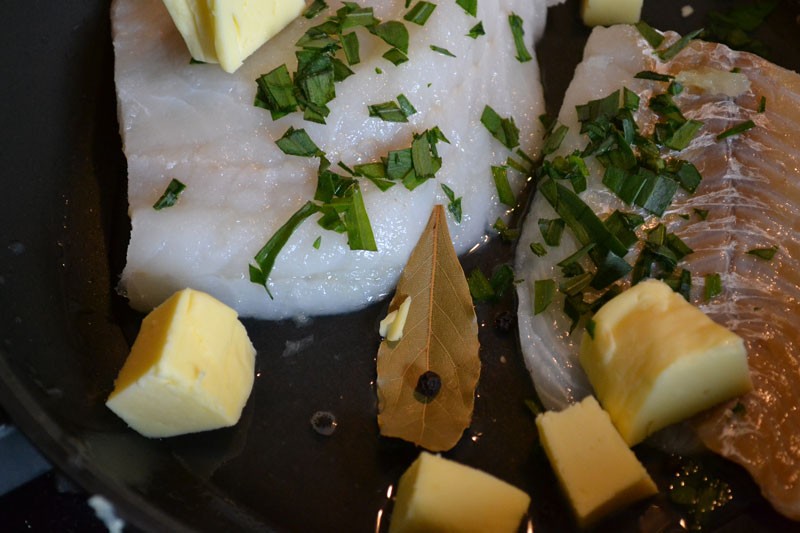 Rybę płuczemy, suszymy papierowym ręcznikiem, przyprawiamy obficie z obu stron solą. Na dużej patelni rozgrzewamy oliwę z oliwek, dodajemy pokrojony w plasterki czosnek, chwilę smażymy, pilnując, aby nie się nie przypalił. Gdy czosnek zacznie wydzielać aromat, dodajemy rybę. Masło kroimy na kawałki i kładziemy na filety. Dorzucamy jeszcze listek laurowy, ziarnka pieprzu, wyciskamy sok z cytryny bezpośrednio na rybę, dodajemy 1 łyżkę natki. Zmniejszamy ogień do minimum, przykrywamy patelnię i dusimy ok. 10 minut, po czym delikatnie przewracamy filety na drugą stronę. Gotujemy jeszcze ok. 5 minut lub do czasu, aż całe mięso zetnie się, a pod naciskiem widelca zacznie rozdzielać się na płatki. Podczas gotowania dorsz puszcza zazwyczaj sporo wody, które w połączeniu z dodanym masłem zamieni się w lekko kremową emulsję. Sprawdzamy, czy sos jest wystarczająco słony, dodajemy jeszcze gałkę muszkatołową i, jeśli lubimy, więcej pieprzu. Na samym końcu dodajemy resztę pietruszki.