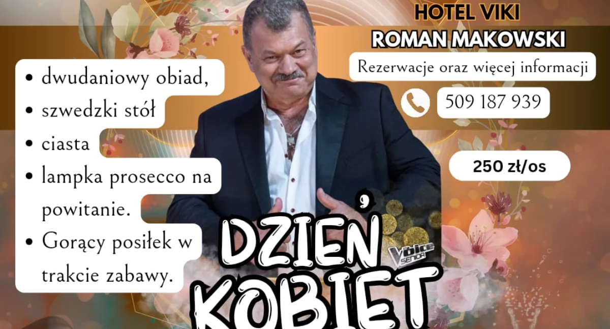 Hotel Viki organizuje wieczór z okazji Dnia Kobiet w sobotę 7 marca. Na scenie Roman Makowski – wokalista znany również z programu Voice Senior w TVP.