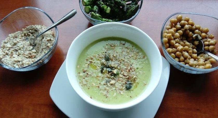 Ziemniaki i cebulę kroimy w kostkę. Szparagi myjemy, odłamujemy łykowatą końcówkę i kroimy w kostkę zostawiając „główki” w całości. Na dnie garnka na rozgrzany olej wrzucamy cebulę i ziemniaki. Smażymy 10 minut, co jakiś czas mieszając. Następnie dorzucamy pokrojone szparagi bez główek (główki podsmażamy osobno na patelni z dodatkiem soli) i smażymy następne 10 min. Całość zalewamy bulionem, dodajemy przyprawy i gotujemy. Po 5 minutach od zagotowania zupę blendujemy na krem.