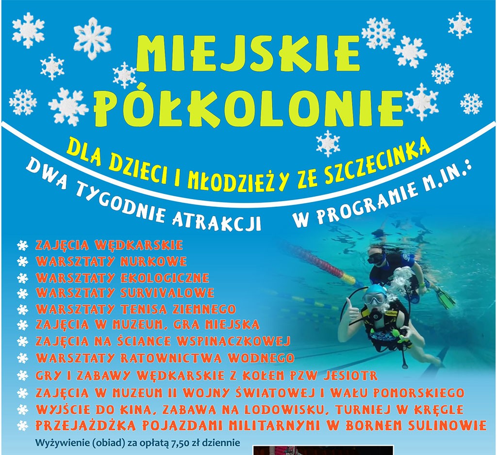 Szkoła Podstawowa nr 1 serdecznie zaprasza na Miejskie Półkolonie dla dzieci i młodzieży ze Szczecinka. Ferie zimowe 2016 przepełnione atrakcjami! 10 dni podzielone tematycznie m.in.: Szczyty i Głębiny, Na Szlaku Historii – Szczecinek Militarnie, Z Wędką za Pan Brat, Poznajemy Region, Na Szlaku Historii – Skarby Szczecinka. Zajęcia wędkarskie, w muzeum – gra miejska, na ściance wspinaczkowej, w Muzeum II Wojny Światowej i Wału Pomorskiego; warsztaty nurkowe, ratownictwa wodnego, ekologiczne i survivalowe; przejażdżka pojazdami militarnymi w Bornem Sulinowie, zabawa na lodowisku, wyjście do kina, turniej w kręgle i wiele, wiele innych! Wszystkie zajęcia odbywają się pod opieką wykwalifikowanej kadry. Zajęcia w dniach 1-5.02.2016r. i 8-12.01.2016r. rozpoczynają się codziennie o godzinie 9:00 zbiórką w holu głównym w Szkole Podstawowej Nr 1, Pl. Wazów 1 w Szczecinku i trwają do godz. 15:00. Zapisy w sekretariacie szkoły : Plac Wazów 1 w godz. 8.00 – 15.00. Wszystkie szczegóły dostępne na stronie www.szlot.pl oraz w harmonogramie ferii (do pobrania pdf)