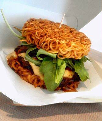 Raminio Ramen Burger - burgery, w których zamiast tradycyjnej bułki znajdziecie japoński makaron Ramen. Możecie wybrać wersję z wołowiną, kurą oraz vege.