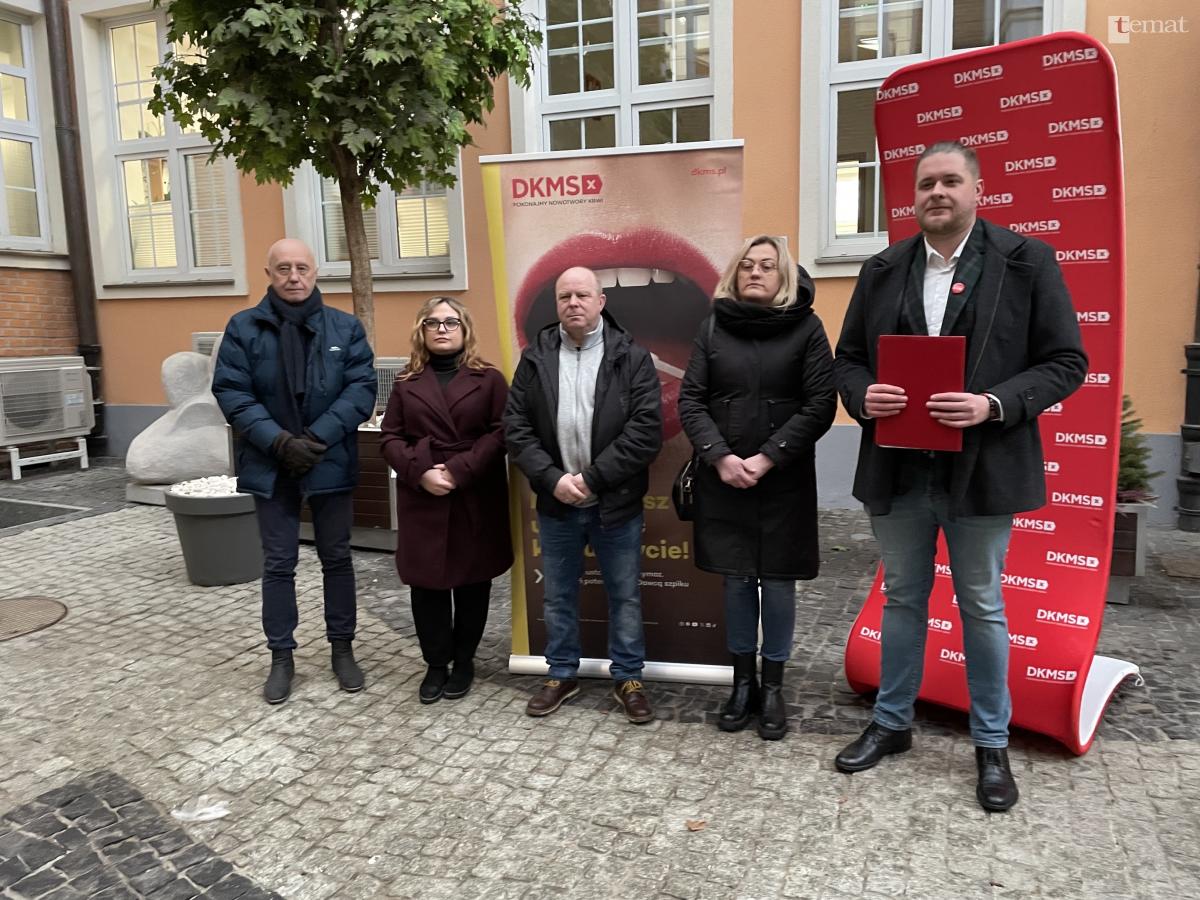 Podczas środowej konferencji udział wzięli burmistrz Szczecinka Jerzy Hardie-Douglas, rodzice 24-letniego Kacpra walczącego z białaczką Agnieszka i Marek Białoch, Mateusz Lis z Fundacji DKMS i dawczyni faktyczna mieszkająca w Szczecinku Anna Kaszucka.