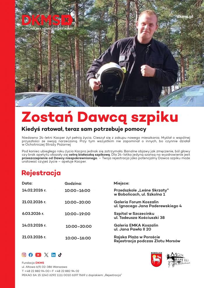 “Statystyki są takie, że w Polsce co 40 minut ktoś słyszy diagnozę, że choruje na nowotwór krwi. Wielu z tych pacjentów będzie potrzebować przeszczepienia, żeby wyzdrowieć. 75 procent spośród tych pacjentów znajduje swojego bliźniaka genetycznego wśród osób niespokrewnionych, czyli poza swoją rodziną. Jedną z takich osób jest Kacper, 24-letni mężczyzna pochodzący z Bobolic, któremu dedykujemy nasze działania”
