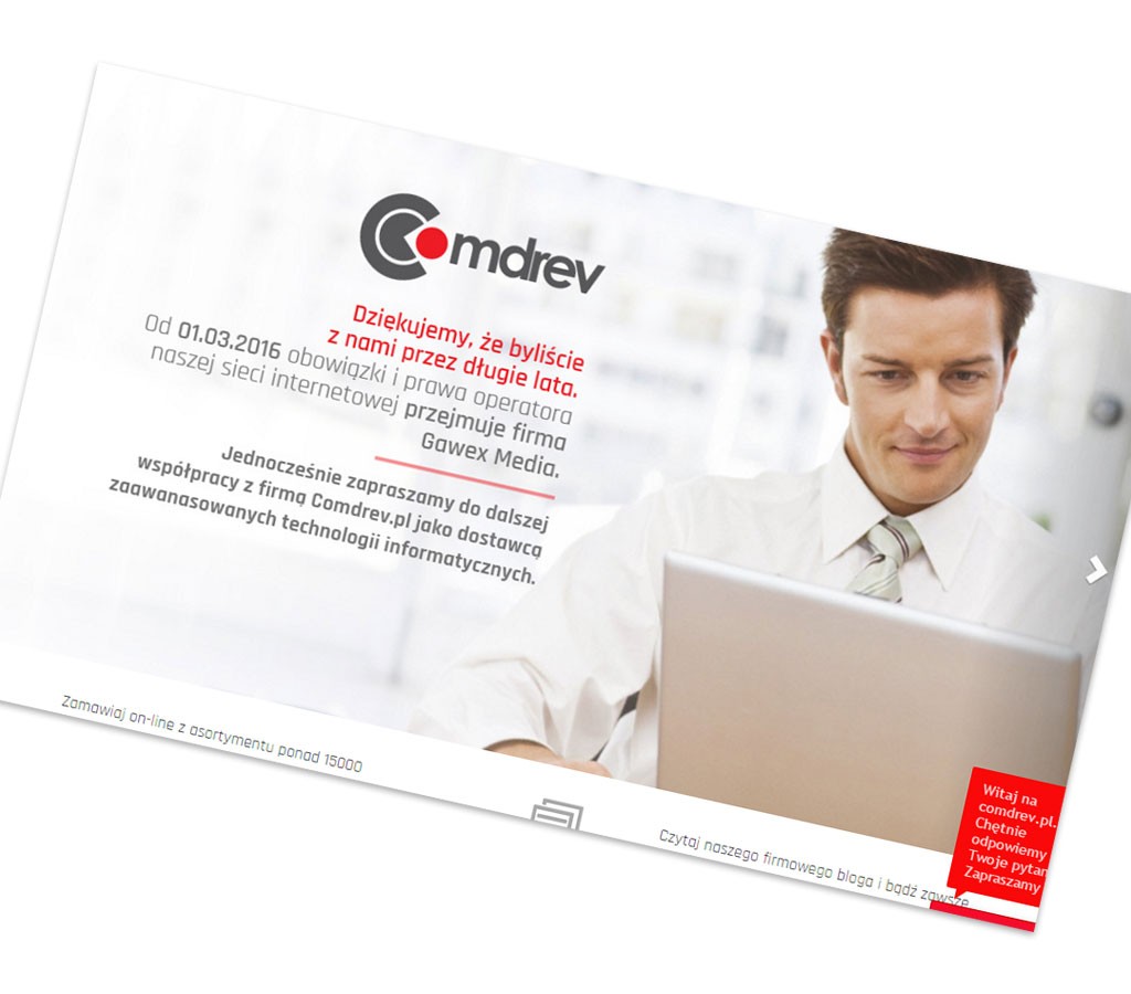 Dziękujemy, że z nami byliście przez długie lata. Od 1.03 obowiązki i prawa operatora naszej sieci internetowej przejmuje firma Gawex Media - taki komunikat wita odwiedzających stronę comdrev.pl abonentów tej firmy. Treść komunikatu potwierdzają Tematowi obie strony.
