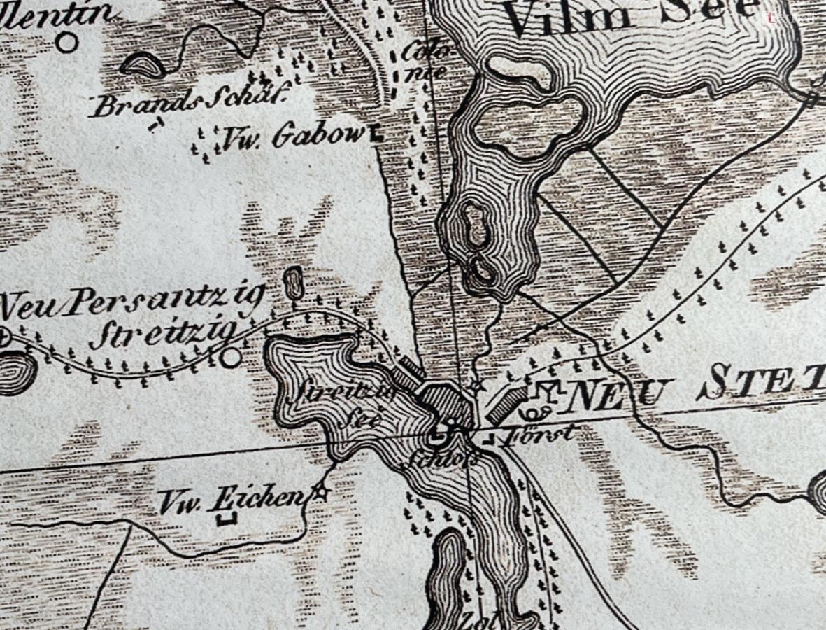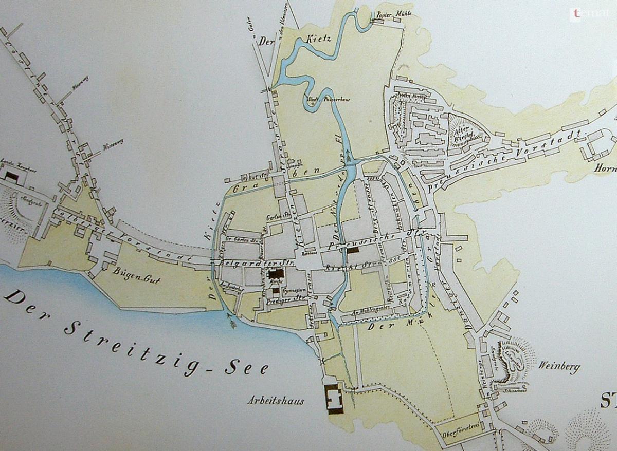 Z 1809 roku pochodzi ten oto fragment francuskiej sztabówki. Wprawdzie z racji skali i ówczesnych możliwości technicznych mapa jest mocno uproszczona, niemniej dość dobrze obrazuje położenie Szczecinka – Nowego Sztetyna. Widać, że trzęsawiska i tereny podmokłe Wielimia sięgały miejskich obwałowań ciągnących się na linii obecnej ul. Jana Pawła II.