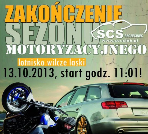 SCS Szczecinek zaprasza na zakończenie sezonu motoryzacyjnego. Już w niedzielę (13.10) na lotnisku w Wilczych Laskach kolejne motoryzacyjne show dla całych rodzin. Na imprezie miedzy innymi: Wyścigi 1/4 mili - dla samochodów (zapisy na 1/4 mili do godziny 12.00. Oplata startowa 20 zł.) 1/4 mili - dla motocykli, pokazy driftu, drift taxi, pokaz oldtimerów, konkurs na najwolniejszą jazdę motocyklem, wybory najładniejszych aut TOP 5. Zamek dmuchany dla dzieci - gratis.