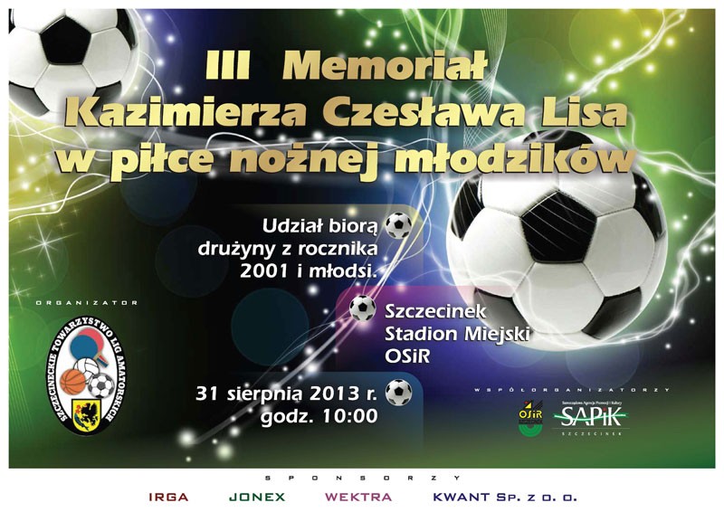 Już w najbliższą sobotę 31 sierpnia, Stadion Miejski im. Kazimierza Czesława Lisa w Szczecinku, będzie miejscem rozegrania trzeciego memoriału swojego imiennika. Kazimierz Czesław Lis, to najlepszy trener i działacz sportowy w powojennej historii Szczecinka. Lista jego zasług i osiągnięć jest ogromna. Wychował wiele setek, a może i tysięcy, więcej lub mniej znanych piłkarzy. Dla uczczenia jego pamięci od 3 lat rozgrywany jest turniej noszący jego imię. Jak do tej pory turniej rozgrywany jest w różnych kategoriach wiekowych. Był więc już turniej trampkarzy, oldbojów, a w tym roku będą to zmagania młodzików czyli młodych graczy urodzonych w 2001 roku i młodszych. W sobotnich zmaganiach wystartuje 7 zespołów: Arkonia Szczecin, Gryf Słupsk, Gwardia Koszalin, Sianowska Akademia Sportu Sianów, Sława Jedynka Sławno, Unia Białogard, Akademia Piłkarska Szczecinek. Początek rywalizacji od godz. 10.00. Siedem drużyn grać będzie systemem każdy z każdym. (zp)