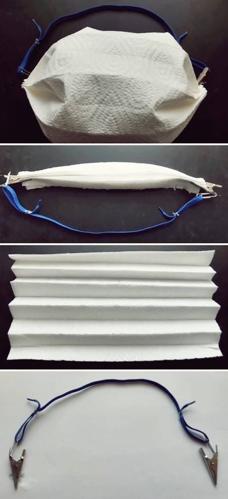 W sieci można znaleźć wiele "patentów" na wykonanie dla siebie jednorazowej maseczki na twarz. Ja osobiście zastosowałem inne rozwiązanie dla samego mocowania, aby wymieniać tylko filtr papierowy. Podwójny arkusz z ręcznika papierowego (można znaleźć ciut większe rozmiary, zależnie od producenta) składamy w harmonijkę o szerokości paska ok. 1,5 cm (im gęściej, tym lepiej), a obydwa końce już tak złożonego papieru zapinamy “krokodylkami”, zakupionymi w sklepie elektronicznym