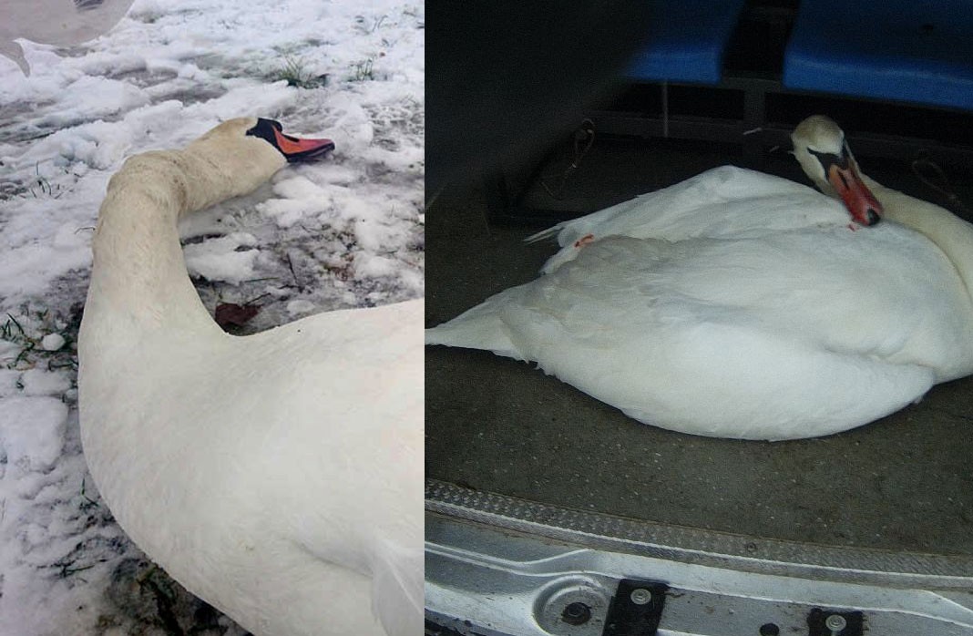 Jednak jeszcze tego samego dnia, około 14.55 w to samo miejsce zostali wezwani strażnicy miejscy. Informacja pochodziła od mieszkanki Szczecinka. Według niej, na brzegu znajdował się zakrwawiony łabędź, nie dający już niemal oznak życia.
