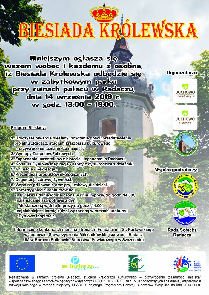 Warto nadmienić, że Królewska Biesiada odbędzie w ramach projektu „Radacz, studium krajobrazu kulturowego – przywrócenie tożsamości miejsca”, współfinansowanego ze środków będących w dyspozycji LGD POJEZIERZE RAZEM, a pochodzących z działania „Wsparcie dla rozwoju lokalnego w ramach inicjatywy LEADER” objętego Programem Rozwoju Obszarów Wiejskich na lata 2014-2020.