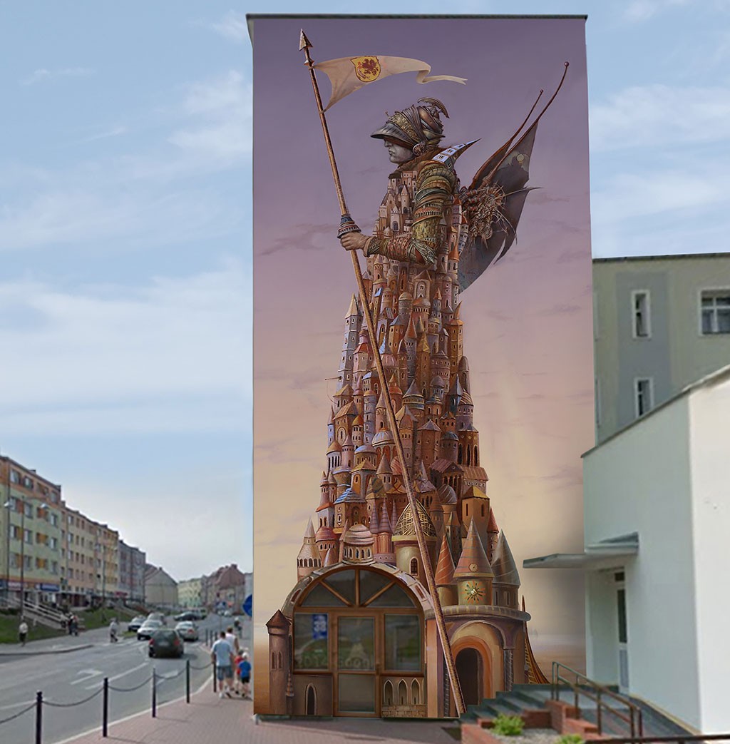 Ukoronowaniem trzydniowego festiwalu było odsłonięcie na ścianie kamienicy przy ul. Wyszyńskiego muralu – trzypiętrowego strażnika miasta. Jestem przekonany, że mural wykonany przez wybitnego artystę stanie się z czasem znakiem rozpoznawczym Szczecinka. Strażnik- nomen omen-stanął niemalże w tym samym miejscu, gdzie przed wiekami znajdowała się Brama Pruska. W tym przypadku protektorem, by nie powiedzieć mecenasem sztuki, okazał się Kronospan. Po mało udanym zeszłorocznym muralu przy ul. Drzymały, ten jest z najwyższej światowej półki. To jeszcze jeden dowód na to, o czym przed chwilą. Może miast corocznych studenckich plenerów rzeźbiarskich fundusze przeznaczyć właśnie na kontynuację tego typu dzieła? Całoroczna galeria pod gołym niebem przy głównym trakcie – dlaczego nie? Nigdzie indziej takich rzeczy nie uświadczysz. Co komu ze studenckich wprawek plastycznych i szukania potem na siłę miejsca do ich ekspozycji? Efekty raczej mizerne – patrz zdychający z wyczerpania gryf u stóp zamkowych schodów, czy choćby piaskowe ekskrementy przy OSiR, ratuszowym dziedzińcu czy SAPiK-u. Tegoroczne wytwory rzeźbiarstwa w drewnie są znacznie mniej odporne na warunki atmosferyczne niż piaskowiec, więc czas ich nie tyle ekspozycji co raczej magazynowania, będzie nieporównywalnie krótszy.