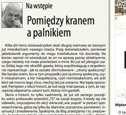 Kilka dni temu doświadczyłem dość długiej rozmowy ze starszym już mieszkańcem naszego miasta. Piszę doświadczyłem, ponieważ jakiekolwiek argumenty do mego interlokutora nie docierały. Na koniec wprost mi oświadczył, że on na sprawę patrzy obiektywnie, czego niestety nie może powiedzieć o mnie. Bo już od jakiegoś czasu (bliżej tego nie określił) gazeta, którą współredaguję z zespołem, nie reprezentuje - jak to zostało sformułowane - „strony społecznej”. Nie bardzo wiem, kto w tym przypadku jest tą stroną społeczną, czyli mieszkańcem, a kto niespołeczną, czyli niemieszkańcem, ale jeśli ktoś tak mocno tego chce, niechaj tak już zostanie. Nie będę oponował. Pamiętam z lekcji historii, że lud rację miał zawsze, z tym, że najczęściej objawiał to ustami tych, którzy nim gardzili.