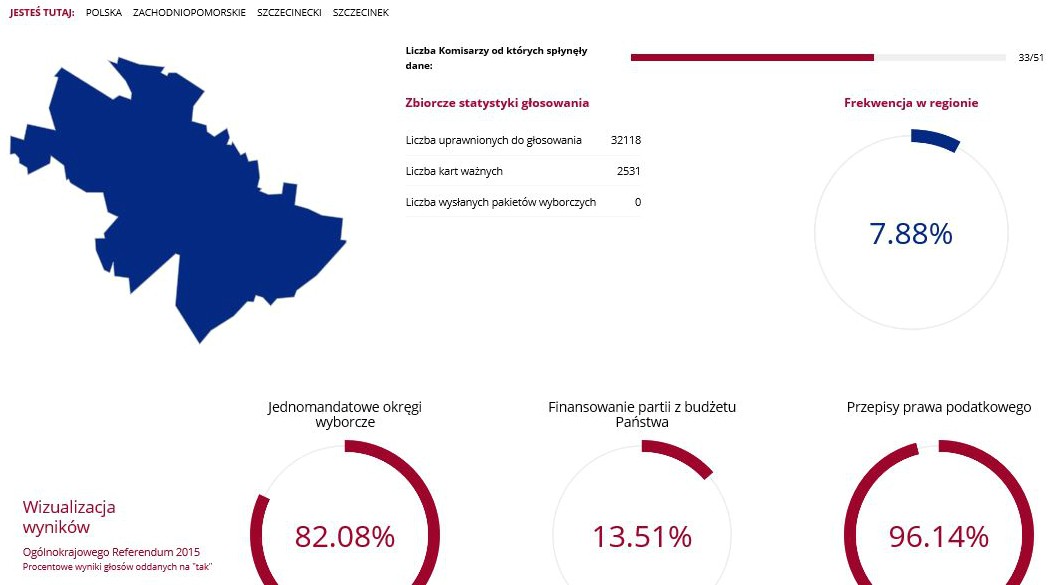Na pierwsze z pytań pozytywnie odpowiedziało 82,08 proc. głosujących w Szczecinku. Na drugie – 13,51 proc. Z kolei na trzecie 96,14 proc. głosujących.