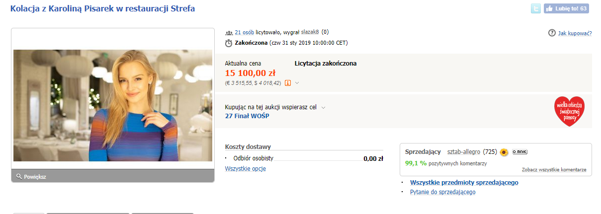 Modelka, która swoją popularność zawdzięcza udziałowi w piątej edycji znanego programu emitowanego przez stację TVN "Top Model" (gdzie dotarła do finału), w tym roku włączyła się w akcję zbiórki pieniędzy na rzecz Wielkiej Orkiestry Świątecznej Pomocy. 21-latka na swoich profilach w mediach społecznościowych kilka tygodni temu poinformowała, że będzie możliwość wylicytowania... kolacji, w której weźmie oczywiście udział. Zwycięzca licytacji (przeprowadzona na Allegro) zje kolację wraz z modelką w warszawskiej restauracji "Strefa". Cena wywoławcza wynosiła 20 złotych, udział w licytacji wzięło 21 osób, a ostateczna kwota do zapłaty, wyniosła 15 100 złotych. Zwycięzcą okazał się być użytkownik o nicku slazak8 (swoją ofertę “przedstawił” już 18 stycznia). Co ważne, składając ofertę kupna, nie można jej anulować i jest ona prawnie wiążąca.