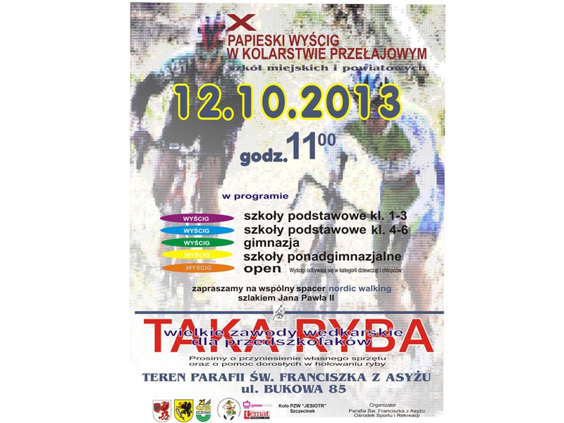 Już w najbliższą sobotę (12 października) na terenach Parafii św. Franciszka z Asyżu przy ulicy Bukowej w Szczecinku, rozegrane zostaną jubileuszowe X Papieskie Wyścigi w kolarstwie przełajowym. Zawody rozegrane zostaną w kategoriach szkół podstawowych, gimnazjalnych, ponadgimnazjalnych i open zarówno wśród dziewcząt, jak i chłopców. Początek rywalizacji o godz. 11.00. Organizatorzy zapraszają jednocześnie na wspólny spacer nordic walking szlakiem Jana Pawła II. Na dzieci czekają wielkie zawody wędkarskie „Taaaka Ryba”, na które prosi się o przyniesienie własnego sprzętu wędkarskiego. Przyda się także pomoc osoby dorosłej przy… holowaniu ryby. (zp)