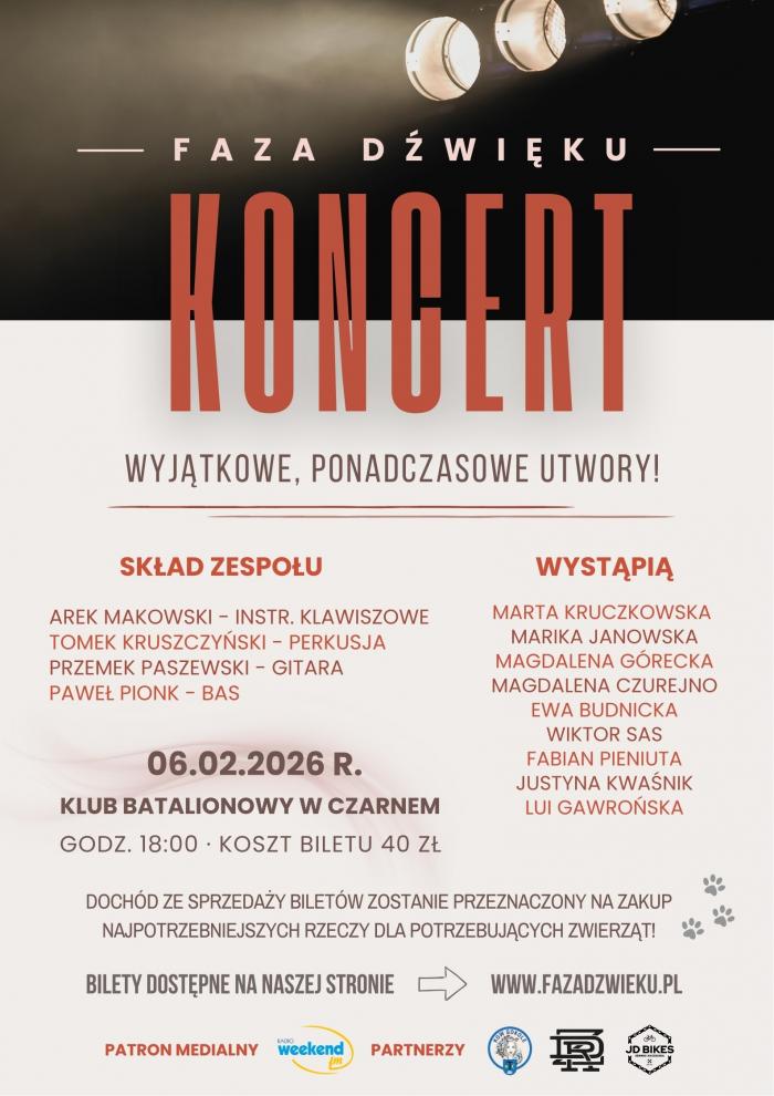 W piątek 6 lutego o godz. 18:00 w Klubie Batalionowym w Czarnem odbędzie się charytatywny koncert pod nazwą “Faza Dźwięku”. Cały dochód zostanie przekazany na zakup najpotrzebniejszych rzeczy dla potrzebujących zwierzaków.