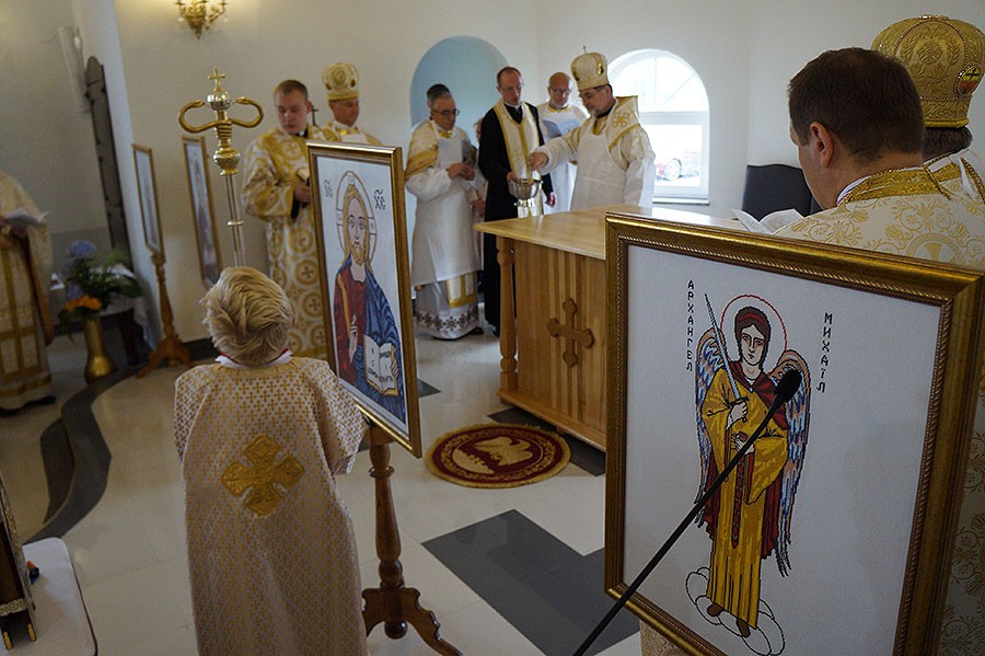 Dziś dość ascetycznie wyglądające wnętrze obliczone na ok. 150 osób wypełniło się do ostatniego miejsca. Głównym koncelebransem był biskup ordynariusz eparchii wrocławsko-gdańskiej Włodzimierz Juszczak. Przedstawiciele tutejszej diaspory powitali go chlebem i solą.