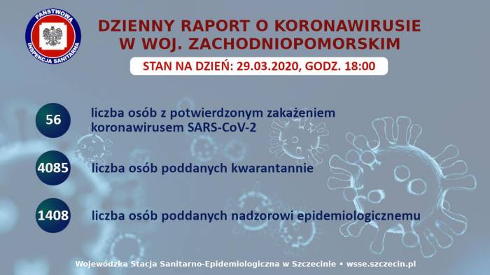 Wczorajszy (29.03, godz.18.00) raport Wojewódzkiej Stacji Sanitarno-Epidemiologicznej w Szczecinie przyniósł informacje o kolejnych zakażonych w naszym regionie.