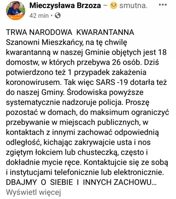 - Proszę pozostać w domach, do maksimum ograniczyć przebywanie w miejscach publicznych, w kontakach z innymi zachować odpowiednią odległość (...) Dbajmy o siebie i innych