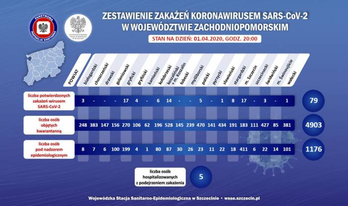 W środę (1.04) po godz. 20.00 szczeciński sanepid poinformował o trzech przypadkach, które dotyczyły: mężczyzny w średnim wieku z powiatu gryfińskiego, kobiety w średnim wieku z powiatu gryfickiego, a także starszego mężczyzny z powiatu gryfickiego.