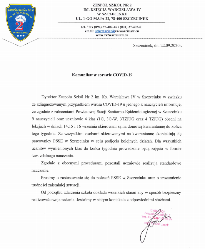 [aktualizacja] Szkoła opublikowała już oficjalny komunikat dotyczący COVID-19 podpisany przez dyrektora. Najpierw otrzymali go uczniowie szkoły.