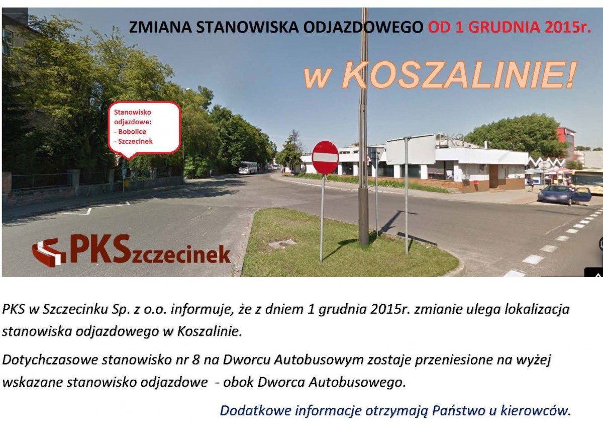Wkrótce pasażerów korzystający z usług szczecineckiego Przedsiębiorstwa Komunikacji Samochodowej czekają kolejne zmiany. Od 1 grudnia osoby podróżujące z Koszalina do Bobolic oraz do Szczecinka zaczną korzystać z innego punktu do wsiadania. Do tej pory zlokalizowany był on na koszalińskim dworcu PKS na stanowisku nr 8. Teraz pasażerowie swoją podróż będą rozpoczynali na przystanku mieszczącym się poza terenem tamtejszego dworca. Powód? PKS w Szczecinku otrzymał wypowiedzenie umowy umożliwiające wjazd naszych pojazdów na teren dworca.