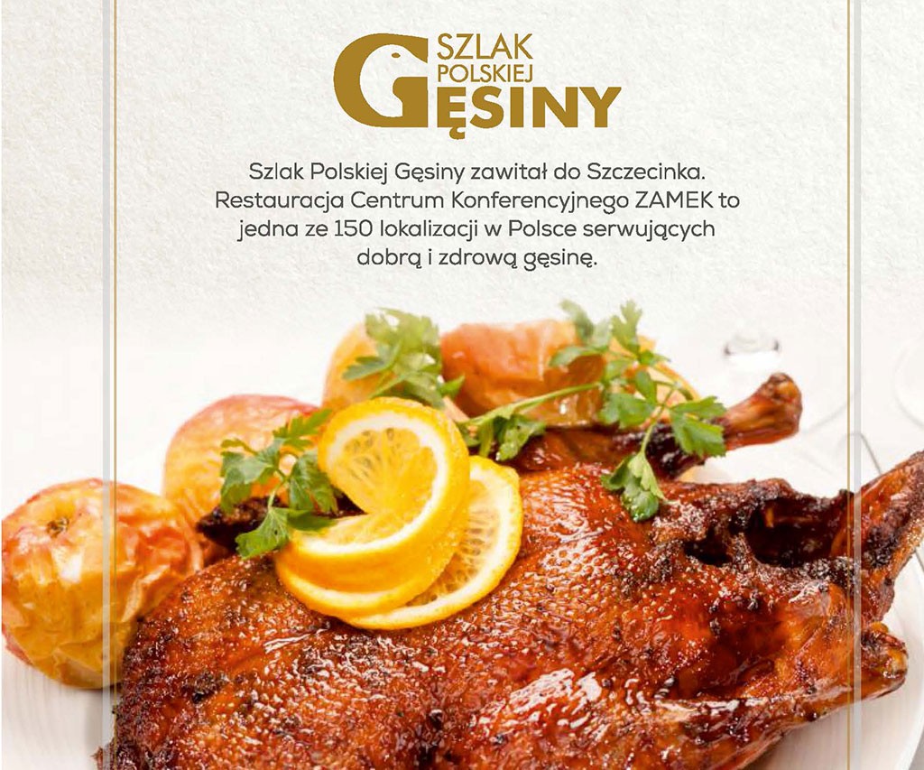 Już od 11 listopada - Święta Niepodległości i Dnia Świętego Marcina Restauracja Centrum Konferencyjnego ZAMEK zaprasza wszystkich smakoszy na potrawy z gęsi. Przez ponad miesiąc ten niezwykle cenny i zdrowy rodzaj drobiu, w różnych formach będzie królował na naszych stołach. W ramach promowania powrotu gęsiny na polskie stoły włączyliśmy się do akcji „Szlak Polskiej Gęsiny”, stając się jedną ze stu pięćdziesięciu restauracji w Polsce, które serwują zdrową, polską gęś owsianą.