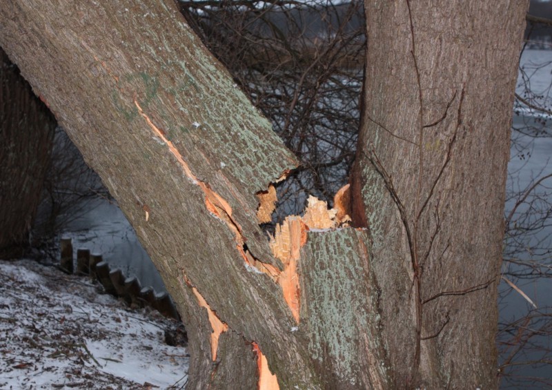 Solidnej wielkości drzewo pod naporem wiatru pękło u nasady w nocy z piątku na sobotę (6/7.12). W sobotę rano teren zabezpieczyli strażnicy miejscy i zgłosili problem naszym służbom. – Tam jest niebezpiecznie, drzewo wisi nad ścieżką rowerową. Może pęknąć. Dlatego przegrodziliśmy szlak taśmą ostrzegawczą – powiedział nam komendant SM Grzegorz Grondys.