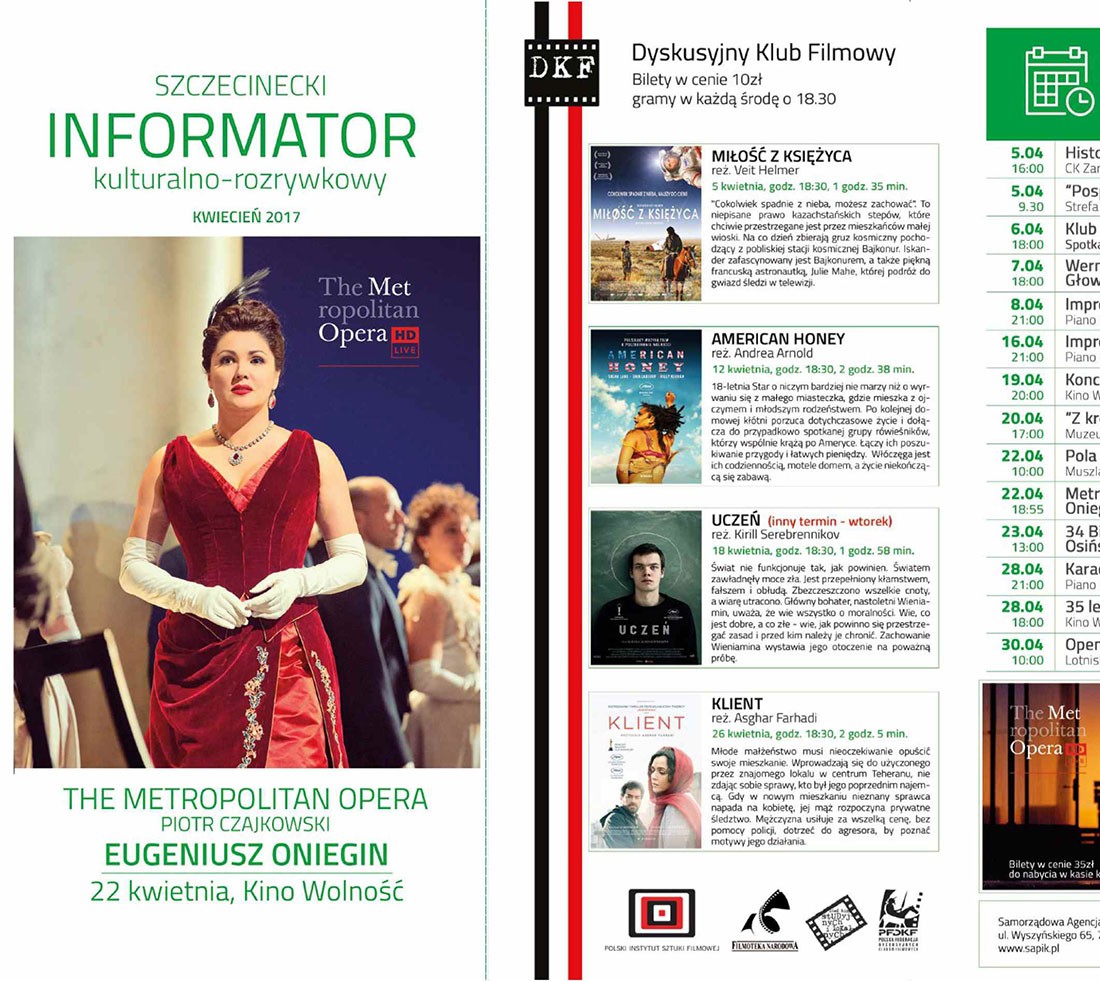 Oferta kulturalna na kwiecień to nie tylko seanse kinowe. Pośród licznych wystaw czy wernisaży odnajdujemy również kolejną już odsłonę The Metropolitan Opera. Tym razem, 22.04 o godz. 18.55 będzie to ”Eugeniusz Oniegin” Piotra Czajkowskiego. Przypominamy, że jest to transmisja, więc warto być punktualnym. Kilka godzin wcześniej wszyscy mieszkańcy będą mieli możliwość zobaczyć, jak szczecinecki ulice zamienią się w morze żółtych żonkili. To znów sprawi kwesta na rzecz szczecineckiego hospicjum „Pola Nadziei” Na ulicach Szczecinka będzie można spotkać uśmiechniętych wolontariuszy z naręczami żonkili w dłoniach.