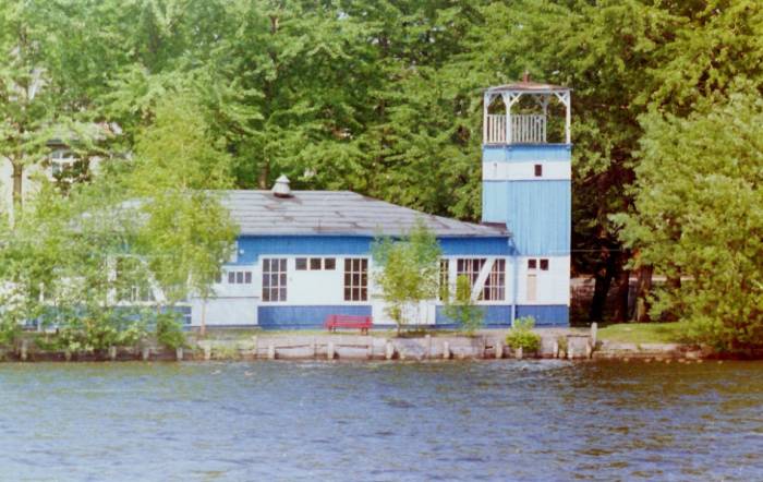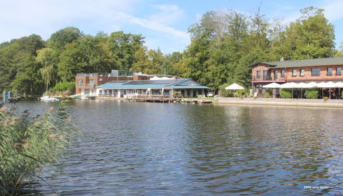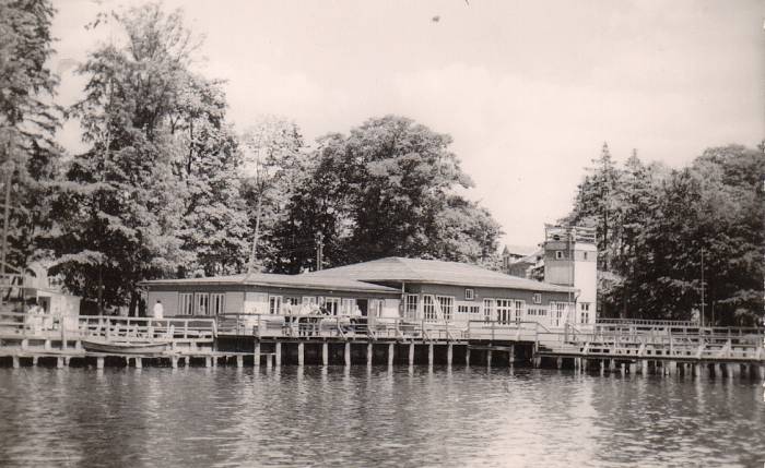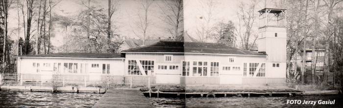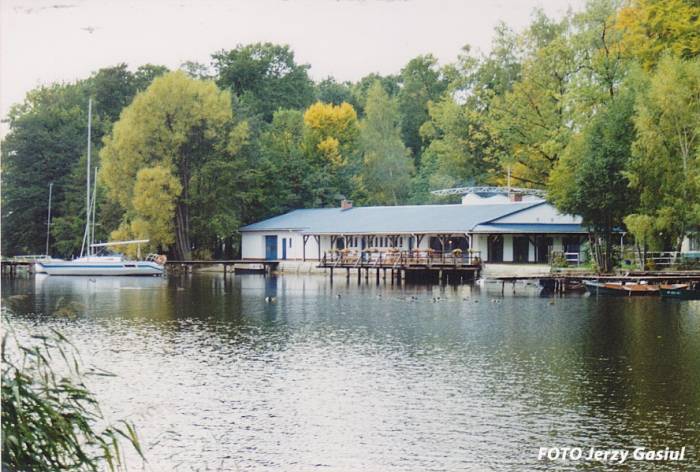 Wzdłuż brzegu, od strony jeziora stanął mocno przeszklony, drewniany pawilon składający się z dwóch ładnie zakomponowanych brył. Jedna z nich była nieco wyższa i w jej narożniku znajdowała się niewielka ok. 6-8 metrowej wysokości wieżyczka. Konstrukcja całego zespołu opierała się na drewnianych słupach. Ściany wyłożone były deskami skomponowane w klasycznym trójpodziale: pas podokienny, okna i pas nadokienny z okapem. Całość została ładnie wpasowana w parkową zieleń. Na uwagę zasługiwały niezwykle rozległe i mocno rozbudowane pomosty. Takich pomostów przystosowanych do cumowania żaglówek i kajaków na Trzesiecku dotąd nie było. Dzisiaj pozostały po nich, od strony Hotelu Active tylko nędzne resztki.