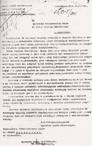 To właśnie w tym gmachu w maju 1945 roku zainstalowała się 25-osobowa grupa leśników pod kierownictwem inż. Władysława Chwalibogoskiego, organizując od podstaw Dyrekcję Lasów Państwowych Okręgu Bałtyckiego. W tamtym czasie w okolicznych lasach wilków jeszcze nie było, a zamiast nich grasowali kradnąc drewno, paląc i strzelając do zwierzyny - żołnierze sowieccy. Jednym z licznych na to dowodów jest pismo dyrektora do pełnomocnika rządu: …wspomniane osoby (dyrektor nie najwyraźniej unika) strzelając do zwierzyny używają pocisków zapalających, od których powstające pożary obejmują tysiące hektarów lasu…