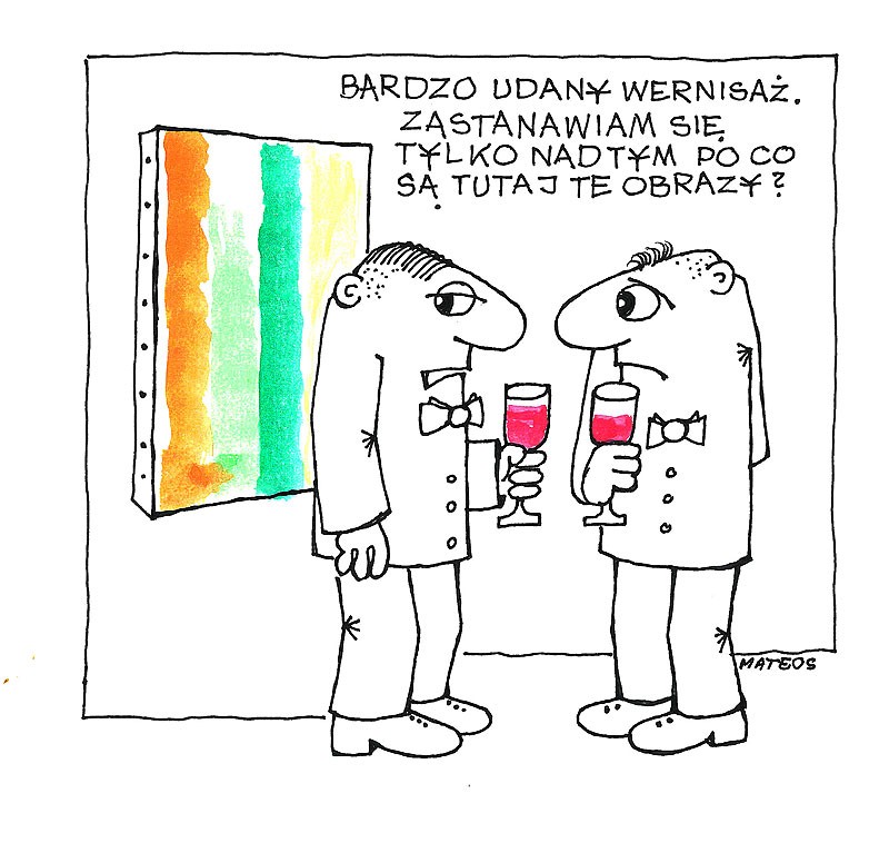 Biedaku pomyślałem, a na głos mu rzekłem: spoko szwagier, gust masz po prostu prywatny, a jak bywać w towarzystwie chcesz, to gust służbowy mieć musowo musisz. No i jeszcze objaśniłem, iż musowo do łba se wtłoczyć musi, iż słuszne jedynie je to, co głoszą znane i uznane osoby - autorytety znaczy się. Wtenczas, bez obaw, będziesz mógł bywać na wernisażach na ten przykład... Tam zaś winko sącząc przed dziełem sztuki oczy swe na przemian mrużyć i szeroko otwierać, szeptać przy tym nabożnie: „interesujące, odkrywcze, inspirujące” i jeszcze wzdychać przy tym. Na koniec jeszcze gratulacje twórcy złożyć. Śmiało też możesz się udać na jakowyś koncert muzyki poważnej, niekoniecznie wiedząc, co jest grane. Wystarczy w trakcie nie przysnąć, nie chrapać i zbyt wcześnie z oklaskami lub też z owacją na stojąco się nie wyrwać. A jeśli na dokładkę wyrywny w mowie nie będziesz i nad tym co insze mówią głową potakująco pokiwasz, to rychło za konesera w towarzystwie mieć cię będą, a twym gustem się zachwycać będą też.