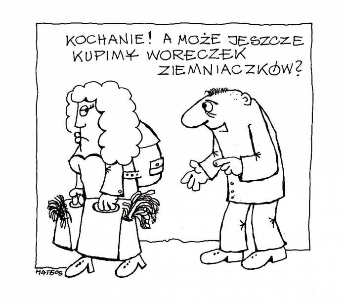 Na naszym tymczasowym rynku w każdy dzień targowy można usłyszeć różniste rozmowy. I nie chodzi bynajmniej o to co zwiędła Pietruszka ma do powiedzenia panu Koprowi, czy inszemu Selerowi. Bo mowa warzyw, jak wiadomo jest mową tajemną i zgoła dla rodzaju ludzkiego niezrozumiałą, no może z wyjątkiem poetów. A że w ostatni piątek na targowisku poetów nie spotkałem, to ludzkiej mowy se posłuchałem. No i usłyszałem: – A to cham niemyty – rzekła jedna pani do drugiej, a ta jeszcze dodała: – Bo to typowa, męska szowinistyczna świnia! I obie zgorszonym wzrokiem spoglądały na damsko-męską parę czyniącą zakupy świeżych i dorodnych (jak to na rynku) warzyw. Ona niewielkiego wzrostu z wielgachną wypakowaną po brzegi torbą na jednym ramieniu i dużą też pełniuśką reklamówką w małej dłoni. A on luzak kompletny, zero jakichkolwiek siatek, czy inszych toreb z zakupami.