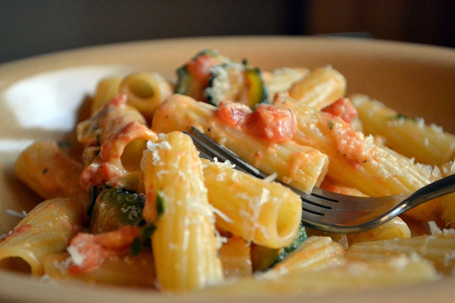 Makaron z pomidorami, cukinią i słodkim mascarpone
