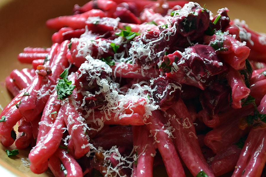 Buraki można też oczywiście ugotować. Ale moim ulubionym sposobem na ich przyrządzenie jest pieczenie. Warto wykorzystać moment, kiedy przygotowujemy pieczyste na niedzielny obiad i wrzucić kilka buraków do piekarnika. Wystarczy je opłukać i, wraz ze skórką i różnymi przyprawami (np. kminek, ziele angielskie), owinąć w folię aluminiową. Można je później podać do obiadu lub odłożyć i wykorzystać do przygotowania nieco nietypowego dania z makaronem, które polecam na ten tydzień. Przepis jest prosty i – jeśli mamy już upieczone buraki – bardzo szybki. Można użyć wszelkiego rodzaju makaronu – ja próbowałam już penne (rurki), tagliatelle (szerokie wstążki), a w tym tygodniu, z ciekawości, spróbowałam z makaronem casarecce. Nieważne, jaki kształt, ważne, aby był udotowany al dente (czyli jędrny, lekko twardawy).