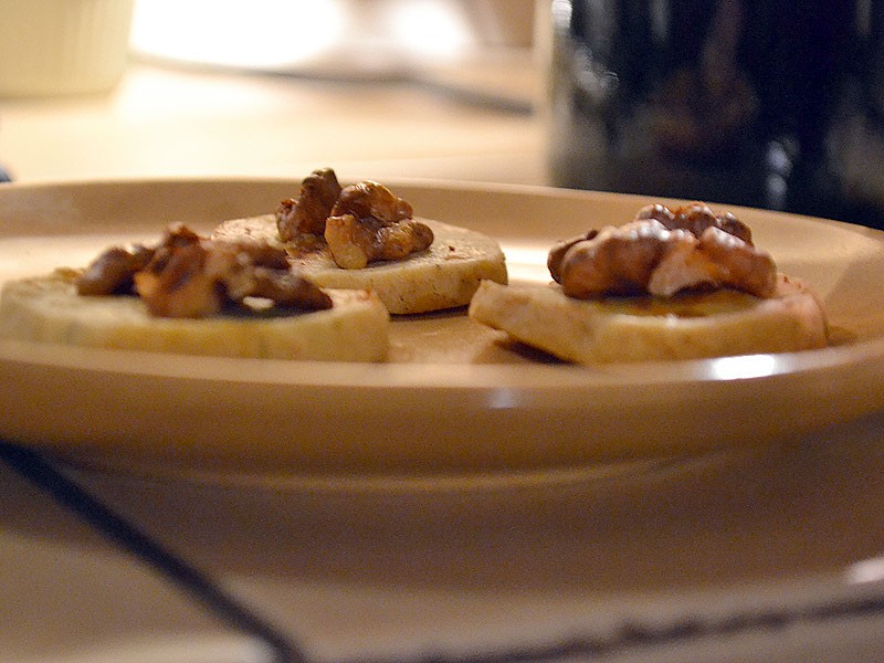 Nagrzewamy piekarnik do 200 °C. Ser ścieramy na tarce o drobnych oczkach. Przekładamy do misy i dodajemy przesianą mąkę, sól, gałkę muszkatołową i pieprz, mieszamy. Dodajemy masło i rozcieramy palcami, aż powstanie rodzaj kruszonki. Przekładamy zawartość miski na blat lekko oprószony mąką i zagniatamy ciasto. Z początku może wydawać się, że składniki nie połączą się ze sobą, ale cierpliwości. W końcu uzyskamy gładkie ciasto, które następnie należy uformować w wałek o średnicy ok. 4 cm. Tak przygotowane ciasto zawijamy w papier do pieczenia i przekładamy do lodówki na min. 3 godziny, możemy je też przygotować dzień wcześniej i pozostawić w lodówce na noc. Gdy ciasto się schłodzi i stwardnieje, odwijamy je z papieru i kroimy na talarki o grubości ok. 0,5 cm. Na każdy z talarków wciskamy delikatnie połówkę orzecha, po czym smarujemy wierzch roztrzepanym białkiem i oprószamy papryką w proszku. Układamy talarki na blasze wyłożonej papierem do pieczenia i wkładamy do piekarnika na ok. 15 min. Wyjmujemy z piekarnika, pozostawiamy do ostygnięcia, a następnie podajemy z drinkami.