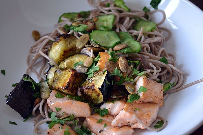 Makaron soba z łososiem, bakłażanem i ogórkiem