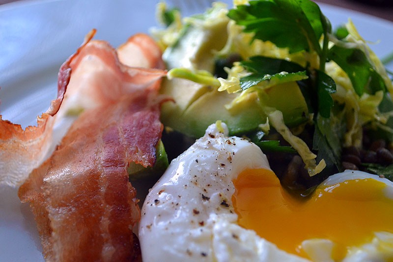 Jaja w koszulkach, chrupiący bekon i sałatka z awokado
