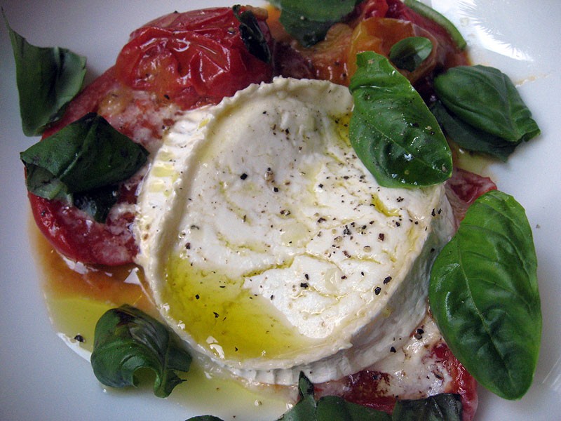 Pomidory malinowe przekrawamy na pół, koktajlowe pozostawiamy w całości. Czosnek kroimy w cienkie plasterki. Na patelni rozgrzewamy oliwę, wrzucamy pomidory, czosnek i solimy do smaku. Przykrywamy i dusimy na maleńkim ogniu przez ok. 10 - 15 minut. Pamiętajmy jednak, aby od czasu do czasu delikatnie zamieszać i przełożyć pomidory malinowe na drugą stronę. Powinny zmięknąć, a pomidorki koktajlowe popękać i puścić soki. Gdy tak się stanie, kładziemy na warzywa kawałki sera, doprawiamy do smaku solą i pieprzem i przykrywamy na kolejne 5 - 7 minut, aby ser zaczął delikatnie się topić. Przekładamy na talerze, skrapiamy resztką oliwy, dekorujemy listkami bazylii i podajemy z pieczywem.