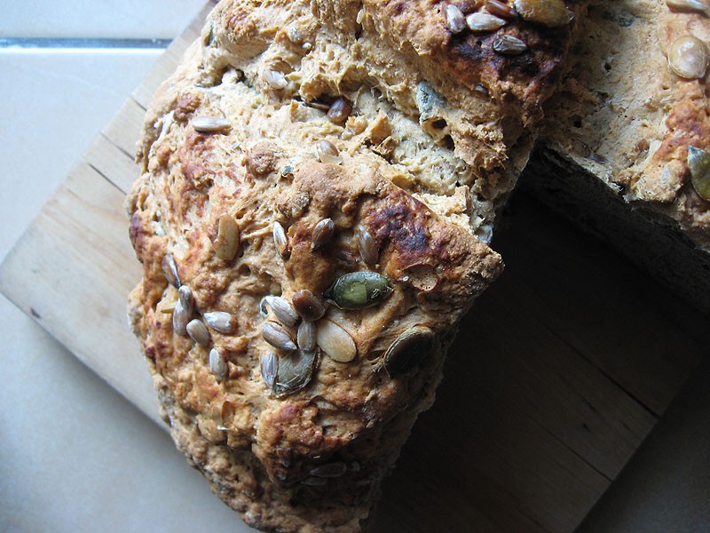 Jest taki chleb, bardzo popularny w Irlandii, który wypieka się bez drożdży, za to z dodatkiem maślanki i sody oczyszczonej. Oba składniki zachodzą ze sobą w taką reakcję, że w rezultacie otrzymujemy piękny, wyrośnięty, rumiany bochen o charakterystycznym, kwaskowatym smaku. Jeśli dodamy jeszcze mieszanki ulubionych pestek (dyni, słonecznika, sezamu, siemienia lnianego), każdy kęs będzie smacznie chrupał, a wypiek zyska na wartości odżywczej.