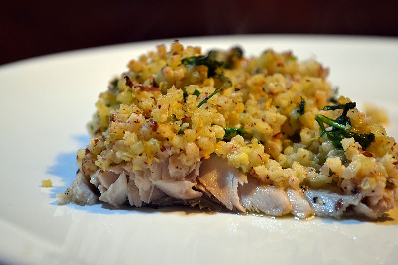 Pstrąg pieczony pod jaglaną kruszonką